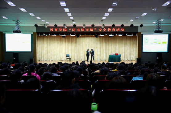 近年来,随着社会的发展、科技的进步,现代通信技术在方便我们生活的同时,电话、手机、互联网通信也成为不法分子实施诈骗等犯罪活动的工具。犯罪分子抓住大学生惧损避害、花钱消灾、社会经验较少等心理弱点,诈骗手法越来越多,极大的损害了大学生的切身利益。针对以上情况,教育学院组织了本次活动,活动首先以根据真实案例改编而成的小品《诈骗公司》开场,小品诙谐幽默,吸引了同学们的注意力,但却发人深省,同学们在娱乐的同时也学会了如何识破骗局。其后,教育学院心理学教师刘晓萌通过播放“山东学生宋振宁遭电话诈骗后猝死”的相关视频,让学生深刻了解到电信诈骗可能危及个人一生甚至毁掉整个家庭,强调了防范电信诈骗的必要性。刘老师还用具体的数据说明了近年来有关诈骗金额、人数等相关情况,通过播放行骗录音来让在场人员了解受骗人上当的心理过程,之后又举出了常见的诈骗手段,例如:法院传票、短信汇款、无担保贷款、盗QQ号冒充熟人等。最后,刘老师为学生播放了一段模拟诈骗的视频,教学生如何识别骗局,遇到诈骗应该怎样应对等一系列安全知识。