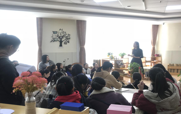 在郑东新区跨世纪幼儿园,陈园长热情地接待了见习的同学。蒙特梭利幼儿园的环境创设有其独特之处,严格按照蒙氏教育的五大领域布置教室环境,幼儿园两位有经验的老师为见习同学们详细地介绍和讲解了蒙氏幼儿园的环境,同学们对蒙氏环境表现出极大的兴趣。随后,幼儿园为见习同学精心准备了一节完整的蒙特梭利课程,包括日常生活领域、数学领域和感官领域的活动。同学们在观摩过程中认真观察并详细地记录。在课程观摩结束后的提问环节中,同学们围绕观看到的教学活动积极地提出困惑,受到了陈园长的表扬和肯定,陈园长结合幼儿园活动实例,深入浅出地为同学们解答疑惑。最后,陈园长运用蒙氏理念,系统地为同学分析了蒙氏教学流程,并向同学们介绍蒙氏教师的工作特点和幼儿的发展,专业而详细的讲解让同学们受益匪浅。
