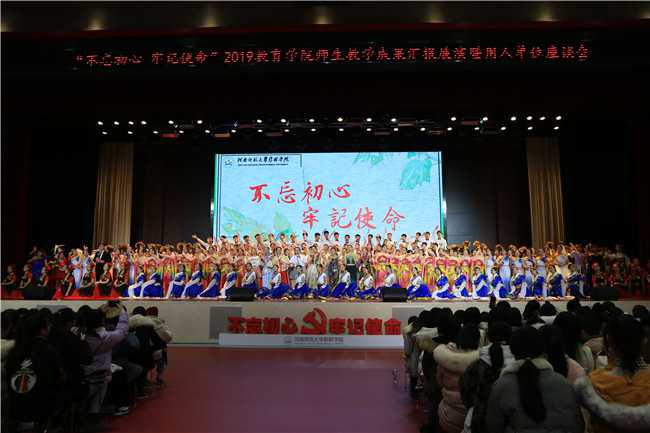 本次演出旨在深入学习宣传贯彻习近平新时代中国特色社会主义思想和党的十九届四中全会精神,也是教育学院聚焦主题,丰富学习教育形式,深入开展“不忘初心、牢记使命”主题教育的创新举措之一。演出由教育学院学前、小教、早期教研室承办,学院300余名师生参与演出。学院团委、辅导员老师、100余名志愿者共同支持。整场演出主题鲜明,形式新颖,内容精彩纷呈,在健美操《奋进向上》中拉开序幕,蒙古舞《塔林呼恒》,器乐《“鼓”动青春》,敦煌舞《丝路绽放》,手工服饰走秀《靓丽青春》,民族舞串烧《大团结》等形式丰富的文艺表演让观众们赏心悦目。婀娜刚劲的民族舞蹈、华丽四射的服饰表演、富有激情的器乐演奏,赢得了现场观众的阵阵掌声和热烈喝彩。“万水千山不忘来时路,鲜血浇灌出花开的国度……”演出最后,所有演员和台下观众一起合唱《不忘初心》,这首曲调悠扬,振奋人心的歌曲,澎湃在每个人的心间,响彻整个场馆,将活动推向高潮。师生用奋进嘹亮的歌声重温艰苦卓绝的峥嵘岁月,向祖国表达崇高的敬意,守初心,担使命,继续朝着实现中华民族伟大复兴的宏伟目标奋勇前进。
