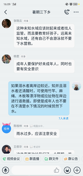 教育学院于8月3日下午13:30准时开展了线上讨论,期间围绕“溺水后如何自救,他人如何施救”主题进行讨论。同学们得出了家长防护不到位,成人会进行盲目施救,孩子对水的危险性不了解,导致会有很多 孩子盲目下水嬉戏游泳,甚至不会游泳的孩子也会跟风。一旦发生危险,成人会在慌乱之中进行盲目施救,不清楚水下情况,以及自身游泳能力不是非常强的施救会造成更大的悲剧。每位同学都积极配合、认真讨论。本次讨论至下午14:00完美结束,结束以后全员进行深刻思考同时表达了自己的感受。
