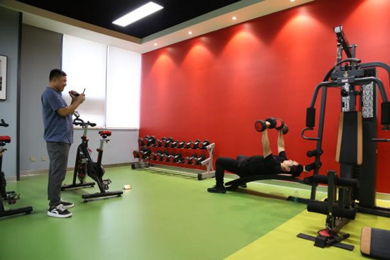 辅导员史云龙展示健身房器械