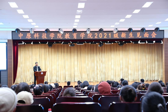 首先,大会伴随着中华人民共和国国歌的奏唱正式开始,院长助理张柯老师代表全体教职工向同学们表示真诚的祝贺和热烈的欢迎,并介绍参会的领导和教师。随后,由教育学院院长李帅军教授致欢迎词,介绍了教育学院的发展历程、师资队伍、专业建设、办学条件、办学成效等。并指出新时代的大学生要树立远大理想志向,不负青春韶华之年。希望同学们立志高远,能够充分领悟中原科技学院“人格、能力、责任、奉献”校训的精义,治经世致用之学、立振兴中华之志。以“敢为人先”的精神和“舍我其谁”的气概,把自己打造成为德才兼备、全面发展的“国民表率、社会栋梁”,担负起国家繁荣、民族富强的历史重任。要学会做一个健全的、和谐的、能适应社会需要和发展的有用的人,接受新思想、吸纳新观点、开拓新视野、探索新方法,学会认真的倾听、研读和批判性的思考,懂得如何学习,如何获得信息,如何培养技能,从而更快地去发现问题、解决问题;由教师代表王惟一老师向同学们表达了学院对21级新生的期许与祝福,希望21级新生不辜负老师对大家的希望,勇于开拓,再创教育学院佳绩;由在校生代表王怡雯同学分享学习心得体会,分别从专业学习、校园生活、社团活动等多方面全方位的进行解读;由新生代表刘嘉琪表达了作为新血液、新力量的21级新生,希望能够在中原科技学院铸就梦想,成就美好人生。最后,党务负责人张柯老师希望全体同学在今后的学习和生活中,充分利用好学校的各种资源,以百倍的热情和昂扬的斗志,投入到每天的学习和工作中,奋发图强、只争朝夕,为建设更加美好的未来努力奋斗。同时还要具备做研究、做学问的学者态度和精神,立足学科本身,不断超越自我。祝愿同学们在新的起点,专心致志,勇攀高峰。