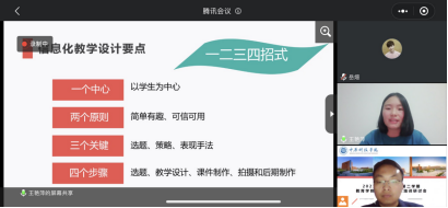为进一步提高我院教师现代教育技术水平,更新教学观念,改进教学方法,提高教学效果。2022年5月14日晚,教育学院在腾讯会议召开了线上培训研讨会,邀请现教中心教学资源开发主管王艳萍老师前来讲解。中原科技学院校长助理、教育学院院长冯蔚,教育学院院长助理周观兵及9名专任教师参加了此次线上培训研讨会,会议由教育学院院长助理周观兵老师主持。