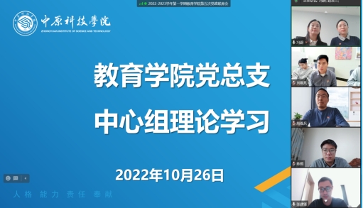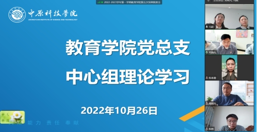 10月26日,为深入领会党的二十大精神,引导我院师生更加主动学习“党的二十大”相关内容,结合当前疫情防控工作实际,教育学院党总支中心组,采取线上方式进行理论学习。本次学习由党总支书记吴国良老师领学,教育学院院长冯蔚老师、副院长李向玲老师、院长助理周观兵老师、院长助理张建锋老师,以及各教研室主任、团总支书记、党务秘书、院办公室主任、院办负责老师出席参加。