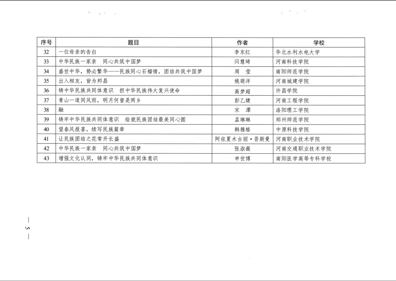 近日,由中共河南省民族宗教委、省委教育工委、河南省教育厅联合发文(豫民宗(2022)49号),公布了河南省“铸牢中华民族共同体意识”主题教育征文活动获奖名单,我校教育学院韩雅格同学的《望春风报喜,续写民族篇章》被评为优秀作品。