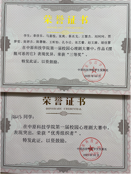 大一推优、组织举办“校园心理剧大赛”并荣获校园心理剧大赛三等奖,组织举办“让风成筝,让笑成颜”心理活动、“心灵解谜”心理知识竞赛、获得社团社旗logo设计大赛一等奖等。