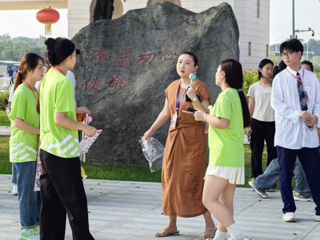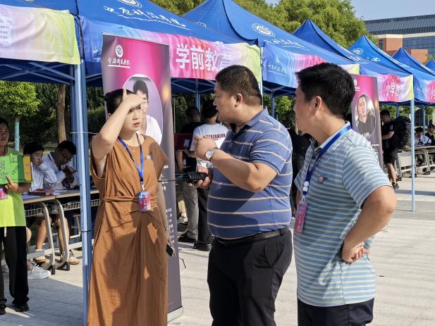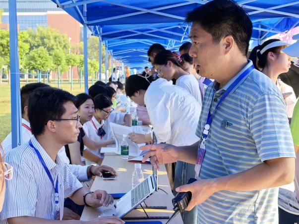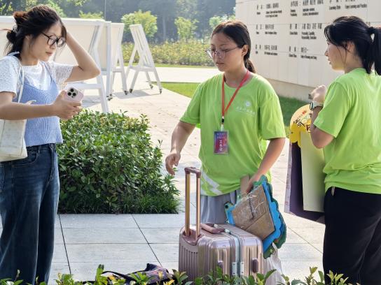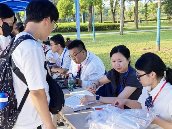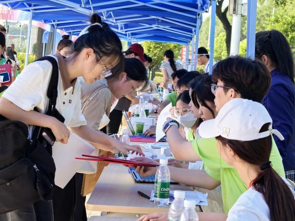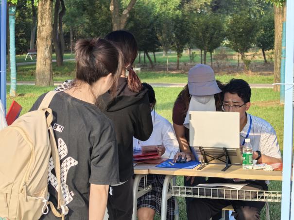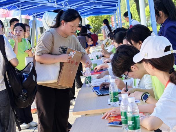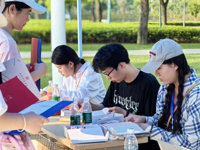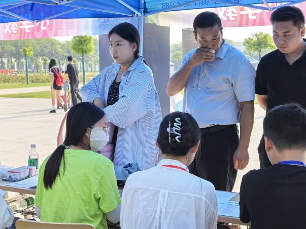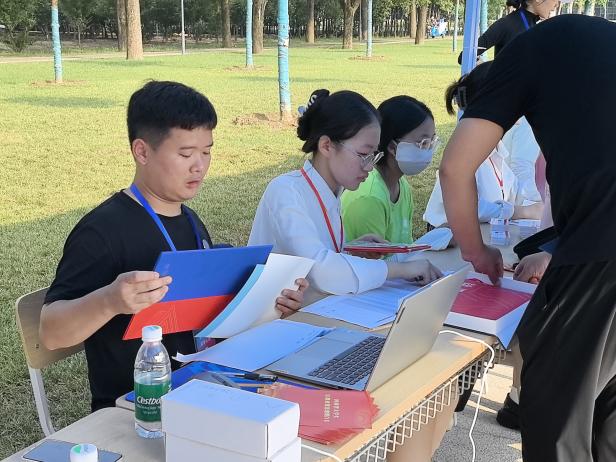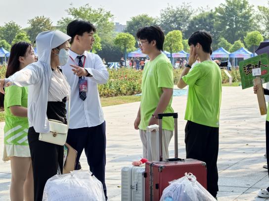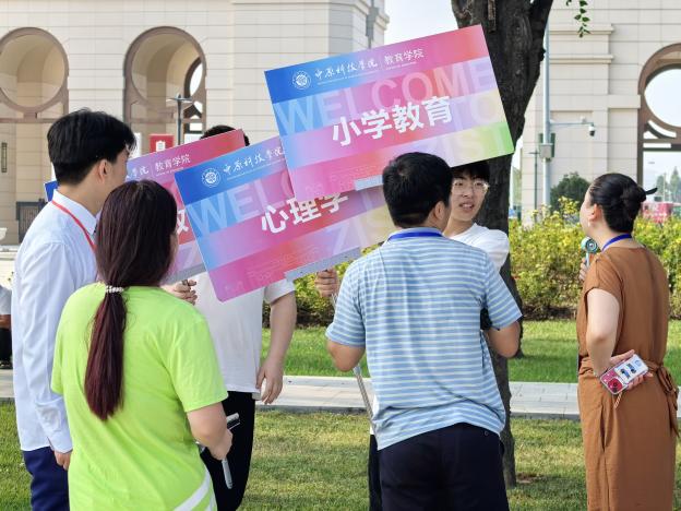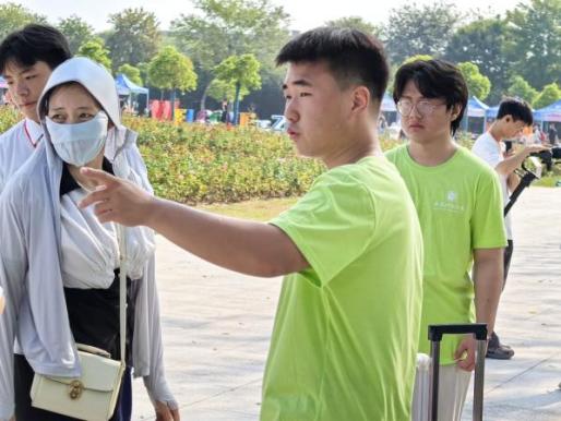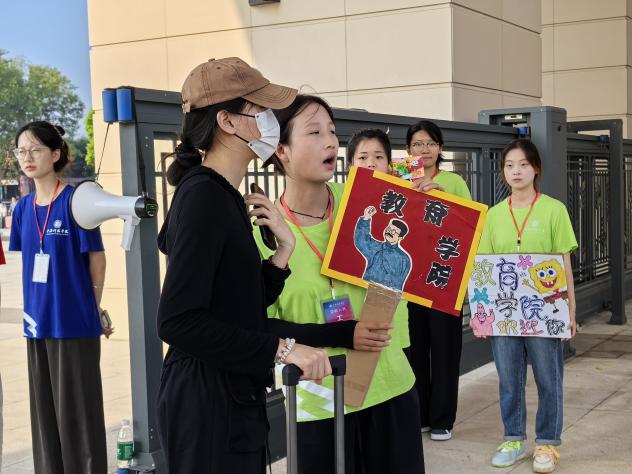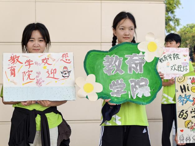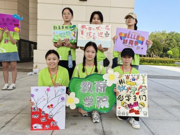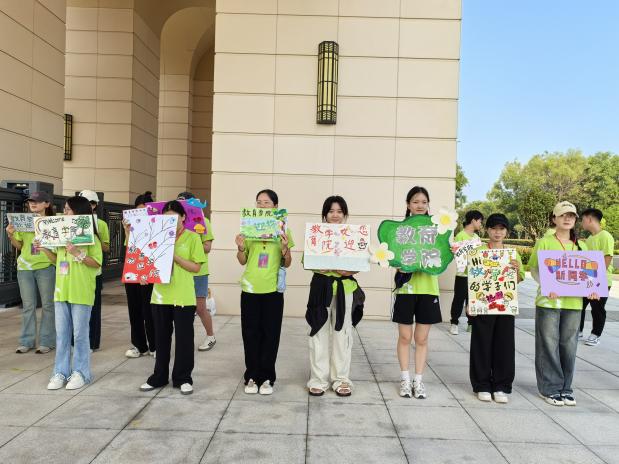 教育学院22级、23级志愿者们身穿绿色文化衫,手拿学院迎新牌,为新同学答疑解惑,提供贴心服务,确保每位新生都能快速找到所在专业窗口顺利完成报到。