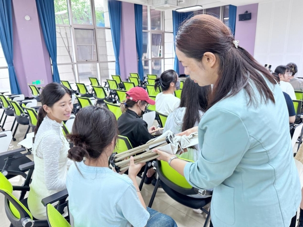冯蔚、吴国良及工作人员向大家发放小马扎