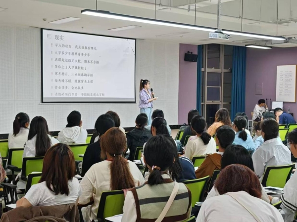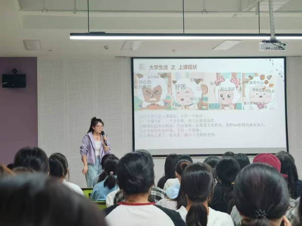 一心教书传知识,不忘育人明事理。讲座伊始,王凯文学姐分享了她的丰富多彩的大学生活,借此指出了其中的挑战与机遇,强调大家面对理想与现实的落差时,更应该在学术上有所追求,向轻松摆烂说“No”。她向学弟学妹们分享了宝贵的学习经验:要做“图书馆的常客”,但不做只会埋头苦读的“书呆子”。她鼓励大家积极参与各种社团活动,以此来培养生活乐趣,锻炼个人能力,以及结识志同道合的朋友。新生们感叹王凯文学姐的大学生活就像是一部精彩的电影,每一帧都书写着奋斗和成长。“渴望光,不如成为光”,王凯文学姐激励大家全力以赴,逐梦寻光。
