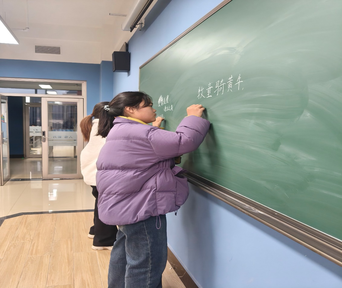 为了激励同学们有意识地培育师范生的必备技能,小教2班于12月3日在行远楼S205举行了一次以“展汉字魅力,扬师者风采”为主题的特色早读活动,由鲁梓琳主持,小学教育2班全体同学共同参加。活动由两位同学上台在黑板上用粉笔分别写一首古诗,然后由其他同学组成评审团,为两位同学的粉笔字打分。以书写的方式传达古诗的魅力,使同学们不仅扩大了知识面,了解了许多古诗词背后的故事,而且更直观地感受到了板书内容与文字书写的重要性,身处于“提笔忘字”的网络智能时代,认真对待书写不仅是为未来教书育人做准备,更是为了传承中华文化、体味书法底蕴。