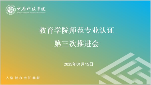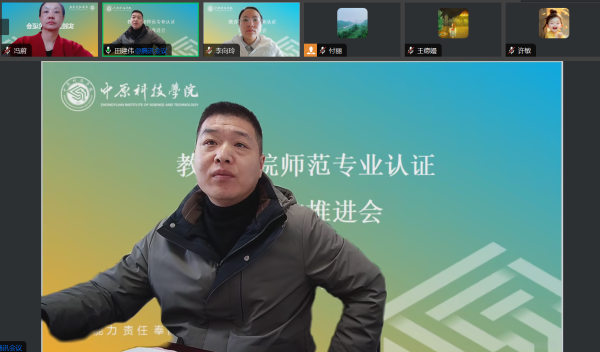 为全面梳理师范专业认证工作阶段性成果,部署下一阶段攻坚任务,确保认证工作高标准推进、高质量落实,中原科技学院教育学院于2025年1月15日在线上召开师范专业认证第三次推进会。会议特邀安阳师范学院教育学院教学副院长田建伟到会指导,中原科技学院校长助理兼教育与艺术学部副部长、教育学院院长冯蔚,副院长李向玲,教育学院专业带头人李晓慧教授,各教研室主任、副主任及骨干教师参会。会议由李向玲主持。