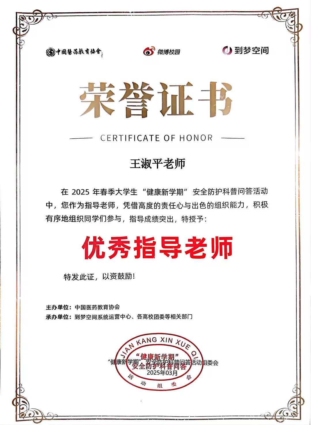 为深入贯彻《“健康中国2030”规划纲要》精神,积极落实校园安全防控体系建设相关要求,进一步提升我校学生多维度健康防护意识,营造安全、健康、和谐的校园环境。近日,中原科技学院教育学院承办的“2025年春季大学生健康新学期安全防护科普问答活动”圆满收官。本次活动中原科技学院教育学院携手中国医药教育协会、到梦空间、联合各高校共同开展共同开展,经指导单位和主办单位审议、专家评审,教育学院在本次活动中表现突出,取得了显著成效。教育学院荣获全国“优秀组织单位”荣誉称号,育人导师王明明、王淑平荣获“优秀指导老师”称号,胡佳澳、程琰同学荣获“优秀组织个人”称号。这些荣誉不仅是对教育学院组织能力的肯定,更是对教育学院在推动校园健康安全教育方面所做贡献的高度认可。