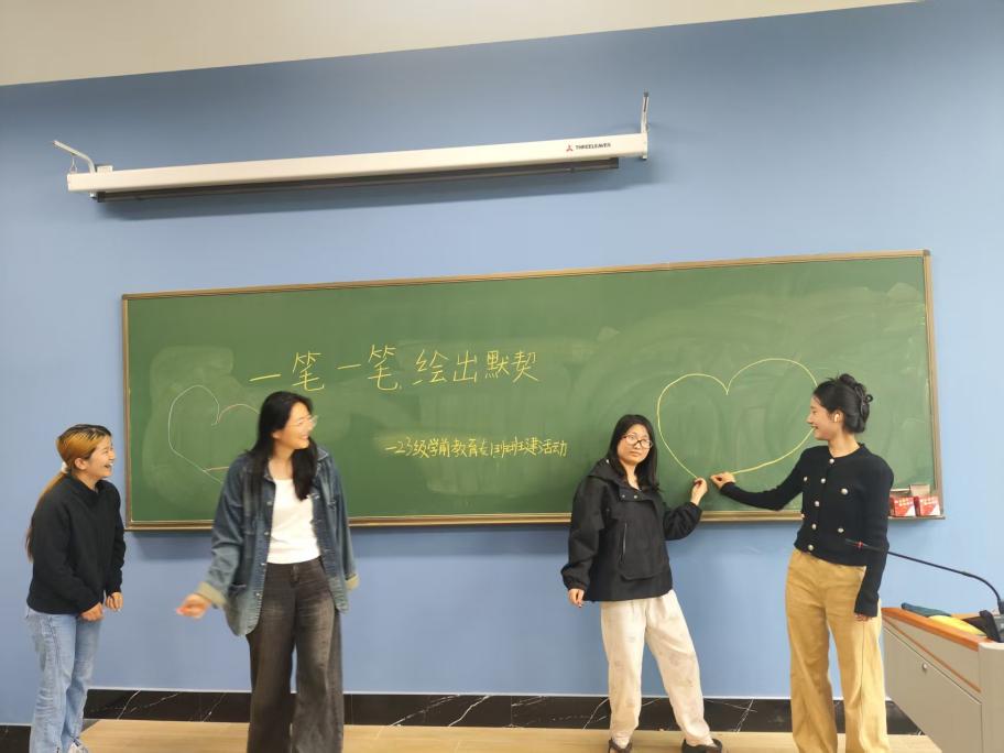 “击鼓传画”环节中,11位同学接力完成的集体画作,每一笔都是默契的注脚;”蒙眼画五官”游戏里,错位的五官因信任与指挥而重获生命力;“背对背画爱心”则让抽象的“协作”具象为黑板上两半相契的图案。这些活动不仅是艺术创作,更是未来幼师对“共情教育”的预演——正如“教育者的笔,既要画出自己的色彩,更要懂得与他人共绘星河”。