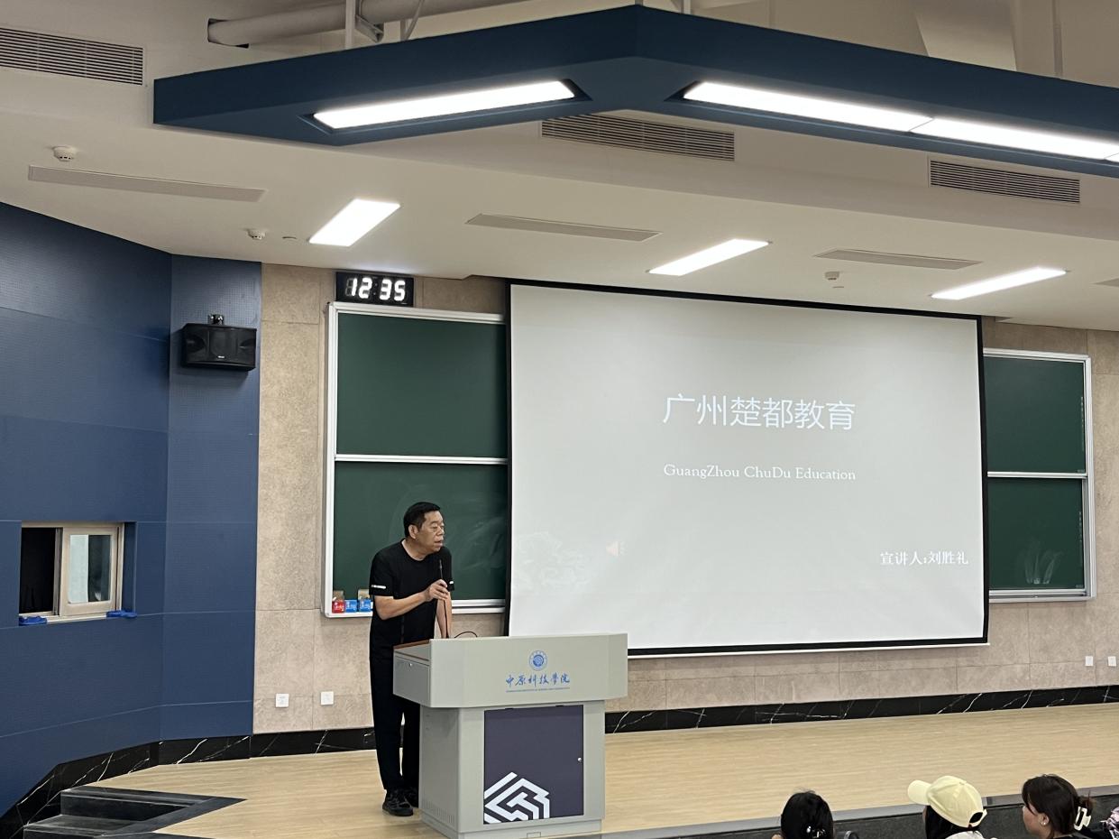 随后,来自广州楚都教育的刘胜礼老师上台与同学们分享交流。刘老师详细讲解了教育行业的最新发展趋势,强调了创新教学方法和信息技术在教育中的应用,为学生们提供了前沿的行业视角,并给出了许多实用的建议,帮助学生们更好地适应实习环境。