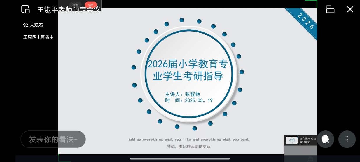 为助力 2026 届小学教育专业学生明晰考研形势、掌握高效备考技巧,5 月 19 日晚 19:00,中原科技学院教育学院通过企业微信平台举办小学教育专业考研线上指导会。此次指导会由教育学院专任教师张程艳主讲,凭借其深厚的学术背景与丰富的教学经验,为考研学子点亮前行灯塔。