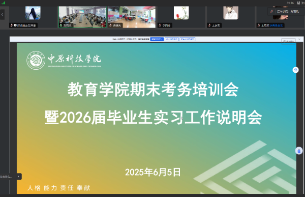 为确保我院期末考试考务及2026届毕业生教育实习工作的顺利开展与进行,切实提升全体教职工对考务及教育实习工作的重视,6月5日,教育学院召开了2024-2025学年第二学期考务工作培训会暨2026届毕业生实习工作说明会,会议分两校区同时进行。中原科技学院校长助理兼教育与艺术学部副部长、教育学院院长冯蔚,教育学院副院长李向玲,教育学院院长助理赵双兰,教育学院党总支副书记曹啸天,教育学院院办公室主任王彦杰及教育学院全体教职工参加会议。会议由王彦杰主持。
