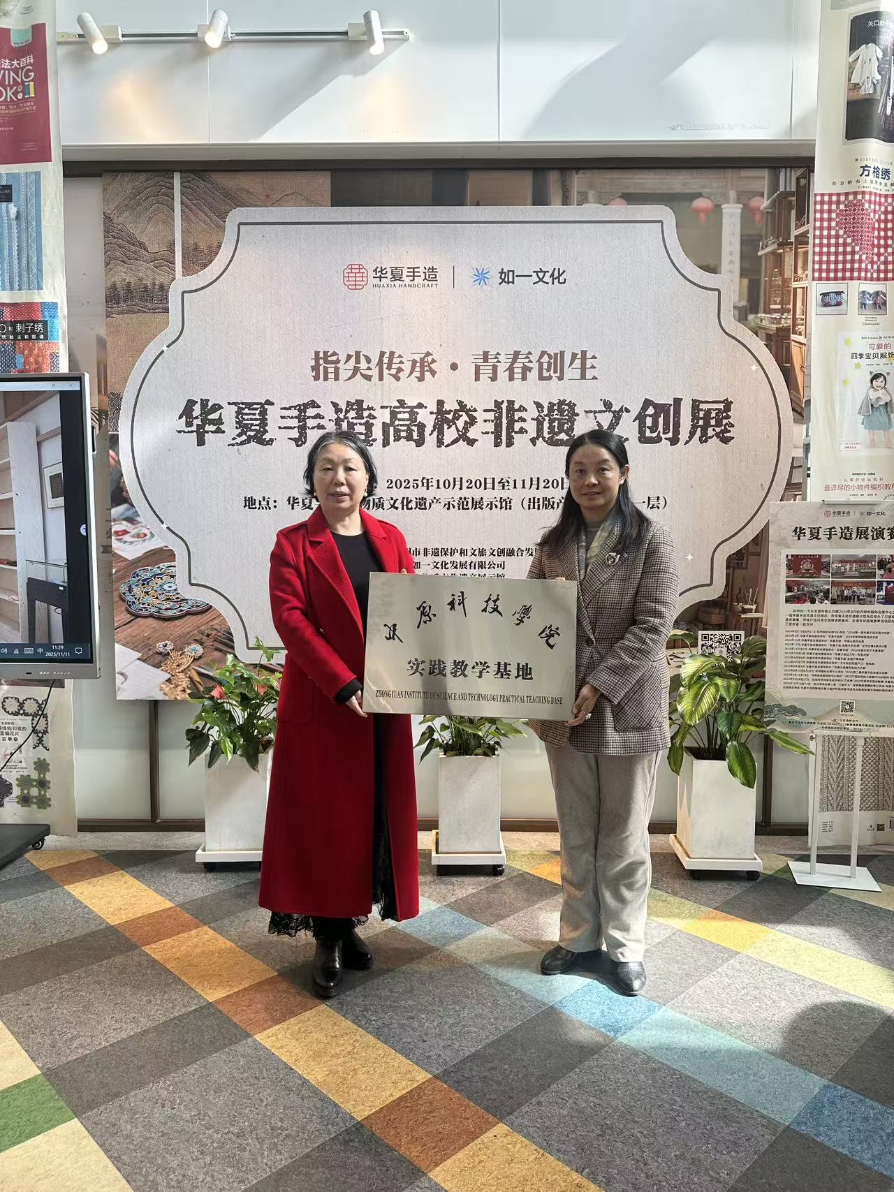 在全场嘉宾的见证下,中原科技学院校长助理、教育学院院长冯蔚与郑州如一文化发展有限公司总经理张海燕共同签署合作框架协议,并为“中原科技学院校外实践教学基地”揭牌。此举标志着双方围绕非遗传承的校企合作进入实质性阶段,旨在打破学术与市场壁垒,推动产学研深度融合,助力非遗技艺在校园传承与市场转化之间搭建桥梁。
