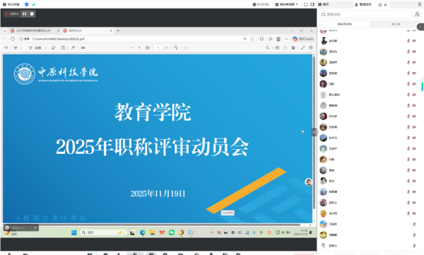为有序部署并扎实推进我院2025年度专业技术职务评审工作,帮助广大教师准确理解评审政策、明确申报流程与相关要求,教育学院于11月19日晚上8点30,通过线上会议平台组织召开了本年度职称评审工作动员会。校长助理、教育与艺术学部部长、教育学院院长冯蔚及拟申报职称的教师参加了此次会议。