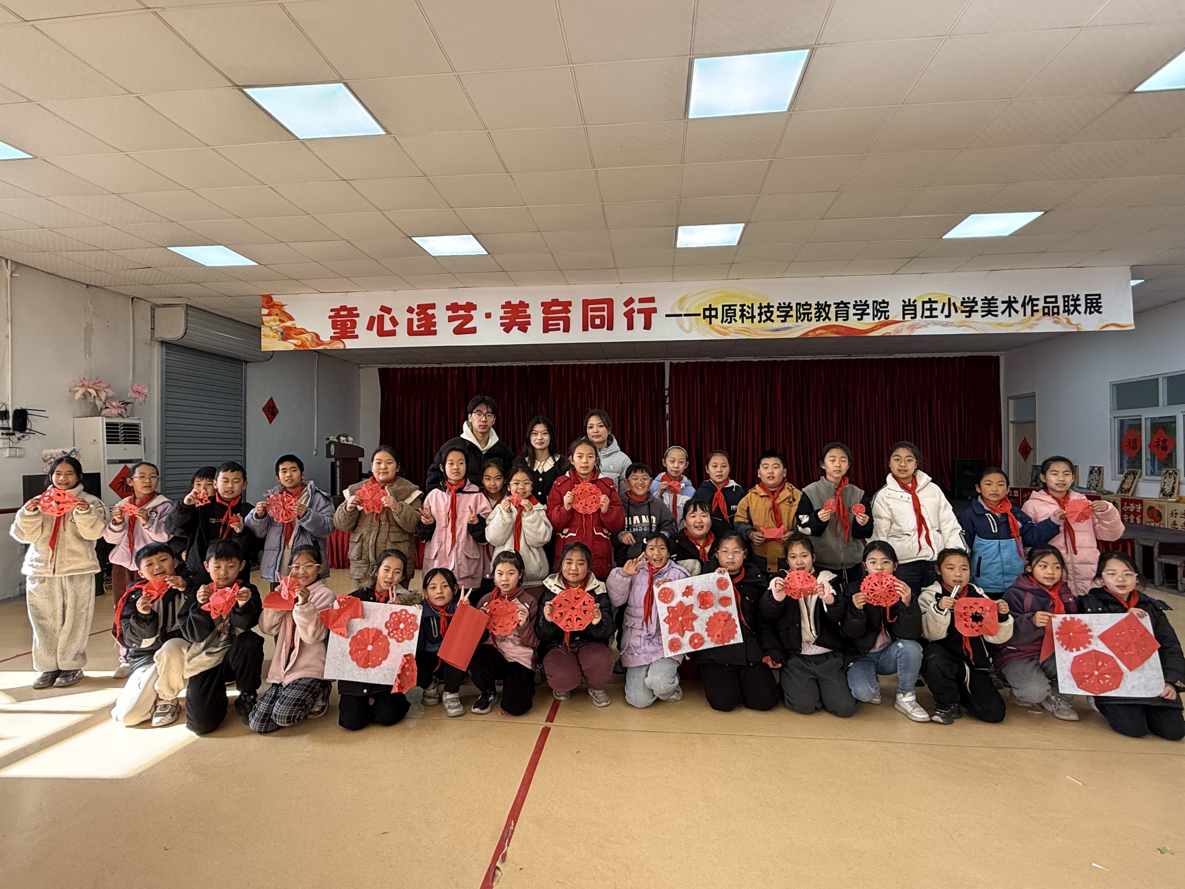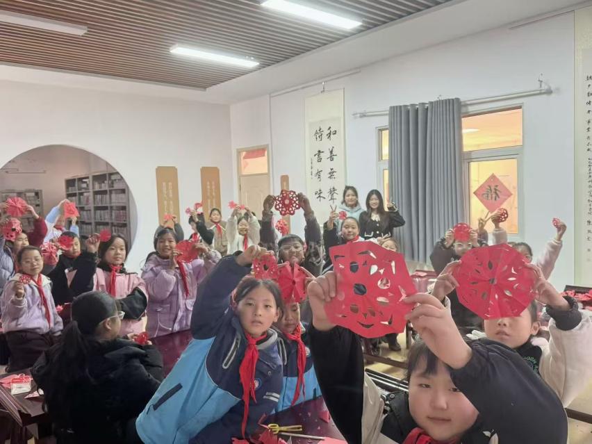 与此同时,中原科技学院教育学院的张雅馨、康瑞宁、葛亿聪三名大学生运用自身专业知识,为肖庄小学学生代表开展了一堂生动的剪纸课程。“大手拉小手”教学实践模式为本次活动增添了一抹亮色。