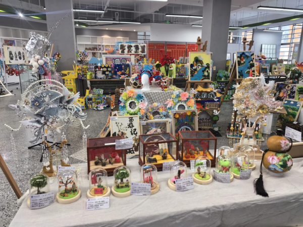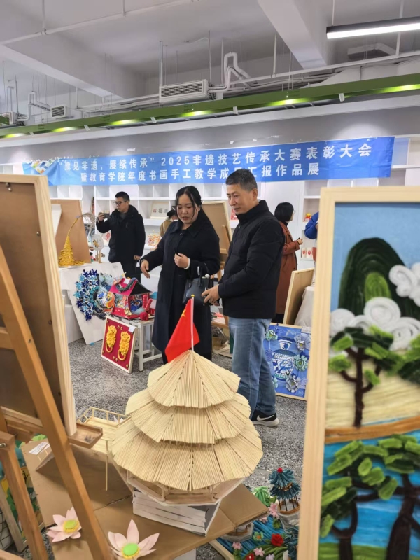 近日,教育学院2025年书画手工教学成果汇报作品展在原道楼北侧A区展厅盛大开幕。本次展览共展出展品1100余件,旨在展示学院在书画手工教学方面的丰硕成果,促进学术交流与文化传承,分为传统非遗、书法、幼儿园环创和玩教具四个主体部分,展出了众多学生精心创作的作品。在传统非遗展区,观众仿佛穿越时空,领略到了古老技艺的独特魅力。精美的传统头饰、华丽的扎染服装配饰以及各类传统手工艺品琳琅满目,每一件作品都凝聚着学生们对传统文化的热爱和对非遗技艺的传承之心。这些作品不仅展现了传统工艺的精湛技艺,更体现了学生们在创新设计上的大胆尝试,让古老的非遗在现代社会中焕发出新的活力。